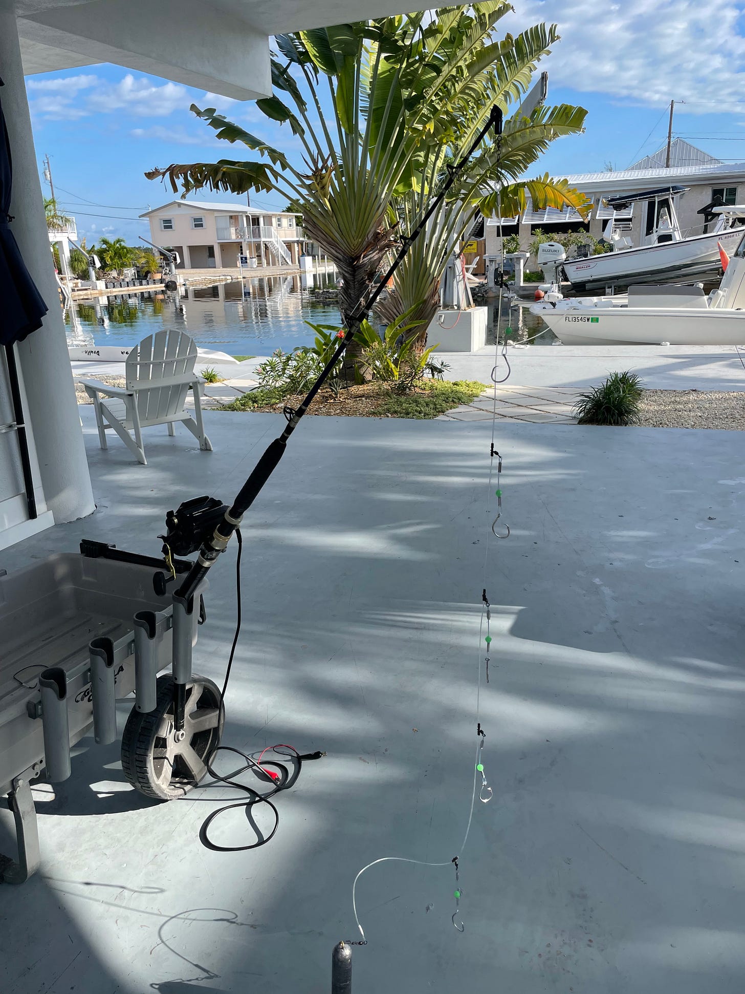 Deep Dropping, fishing the bottom in hundreds of feet of water, requires specialized gear. Most use electric reels with heavy line. The picture is the rig I used to catch the Snowy Grouper above. From the bottom up: a five pound weight, a chicken rig with 5 hooks (I used whole squid for bait), 120# leader, and braid line leading to the electric reel. It is expensive with the weight alone costing $25-.