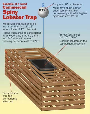 Lobster traps are larger, 3’ x 3’ x 2’ and are baited with short (juvenile) lobster. The spiny lobster is a communal animal and the smaller lobster and the structure and apparent shelter of the trap are both attractants. Once the trap is pulled, the lobster are kept alive in large live wells aboard the commercial boats.