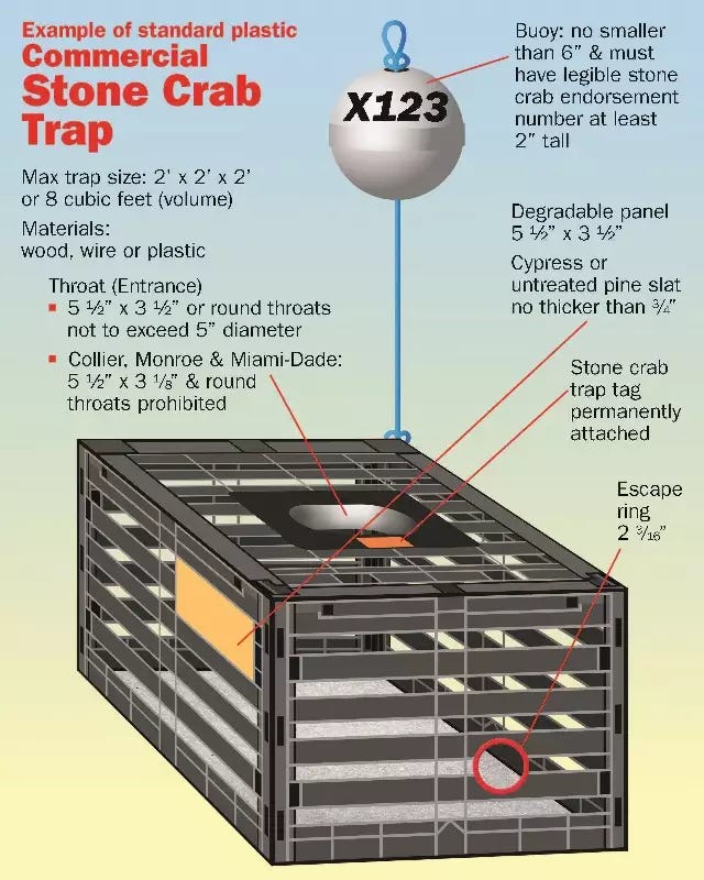 Stone crab traps are 2’ x 2’ x 2’ and are baited with almost anything. Hogs feet are a go-to as they last. I’ve personally had the best success by jamming the trap with fish carcasses. Mackerel and bonito seem to be favorites. The stone crab will eat everything from standard baits to table scraps to - you’ll have to read the book.
