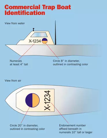 Wood’s Bones gets into both methods as well as the identification of the traps and vessels. Each commercial operation has a designated color and pattern for their buoys. These are required to be submitted to the state and displayed in an 8” circle on the boats wheelhouse and a 20” circle on the roof. Also displayed are the saltwater products license, vessel registration, and endorsement number.