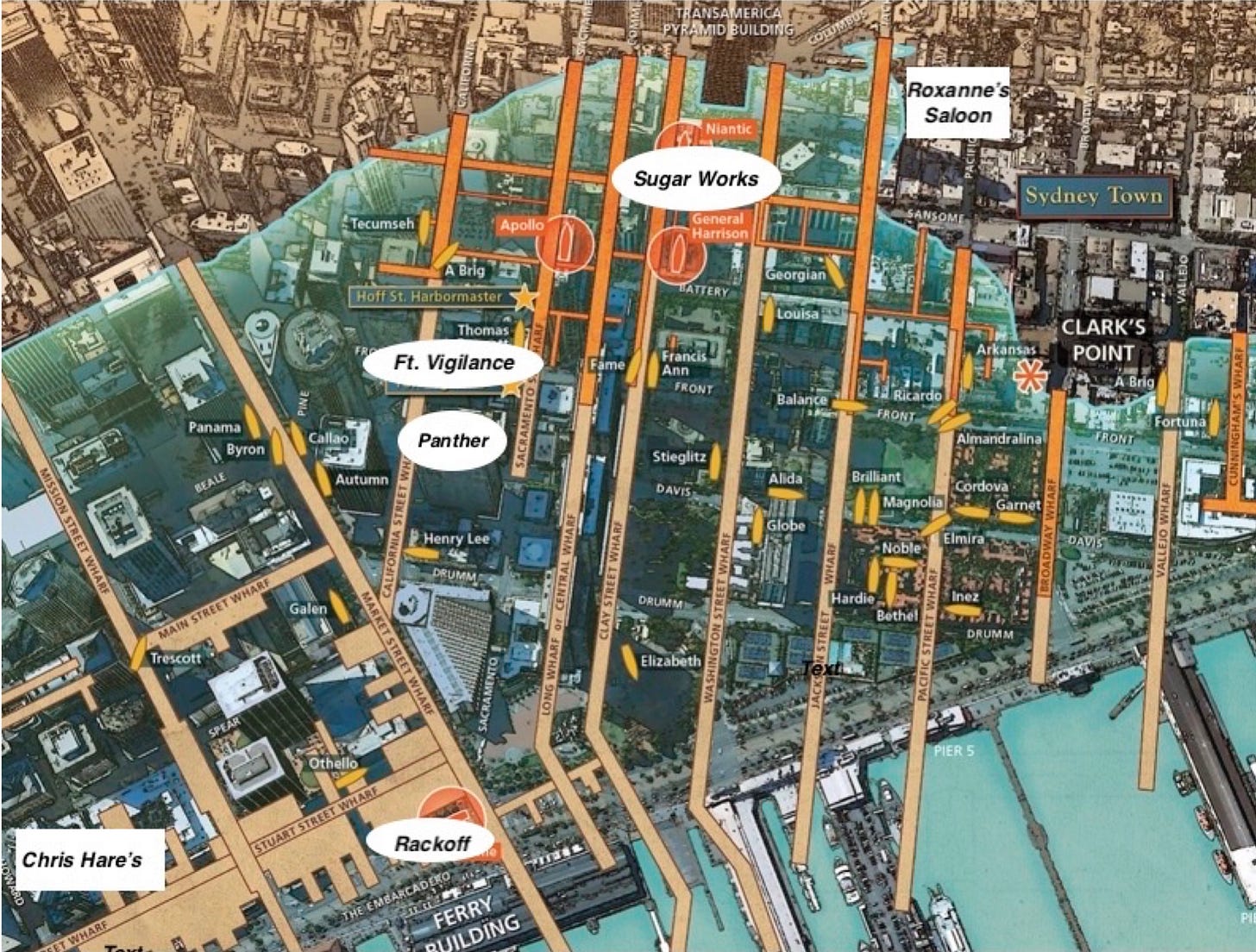Many argonauts, as the gold seekers were known, were in such a rush to hit the gold fields that they abandoned their battered ships and headed for the hills. The harbor became a cluttered mess and the ships were eventually stripped and became “land”. A system of wharfs extended the cities streets to reach the new terra firma and the land was deeded to the ships owners.